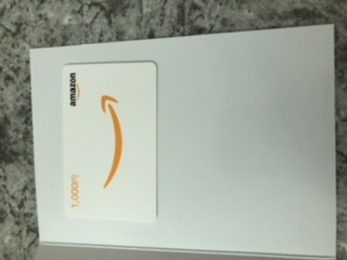 このたびコエタス様よりAmazonギフト券1000円当選しました。ありがとうございます。まさか当選すると思っていなかったので大変うれしいです。白い封筒に入って届きました。中には、メッセージもかけるスペースのある台紙に、Amazonギフト券1000円分のカードがついてます。カードの裏面にギフト券番号が書いてあります。ギフト券番号をアマゾンのサイトに登録するだけで1000円分チャージされます。とても簡単です。いつも友人にプレゼントを送るときアマゾンから商品を選んでいましたが、今度からはこういったAmazonギフト券でプレゼントしてみたいと思いました。たくさんの商品から自分の好きなものを選べるため大変良いと思います。1000円あるので自分のご褒美に好きなものを買います。ありがとうございました。
