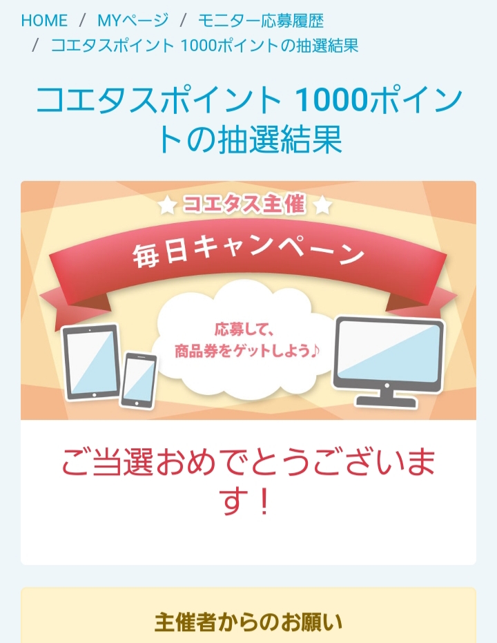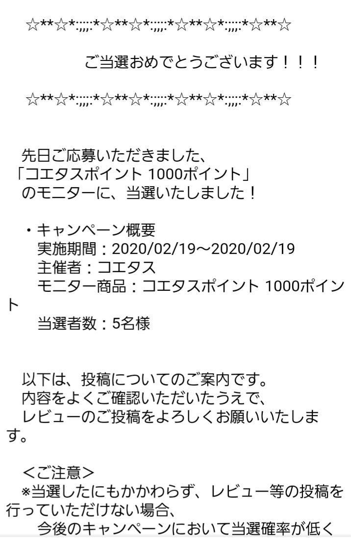 先日登録したばかりのコエタス。 沢山あるモニター募集の中からまず最初に応募したのがコエタスポイン...