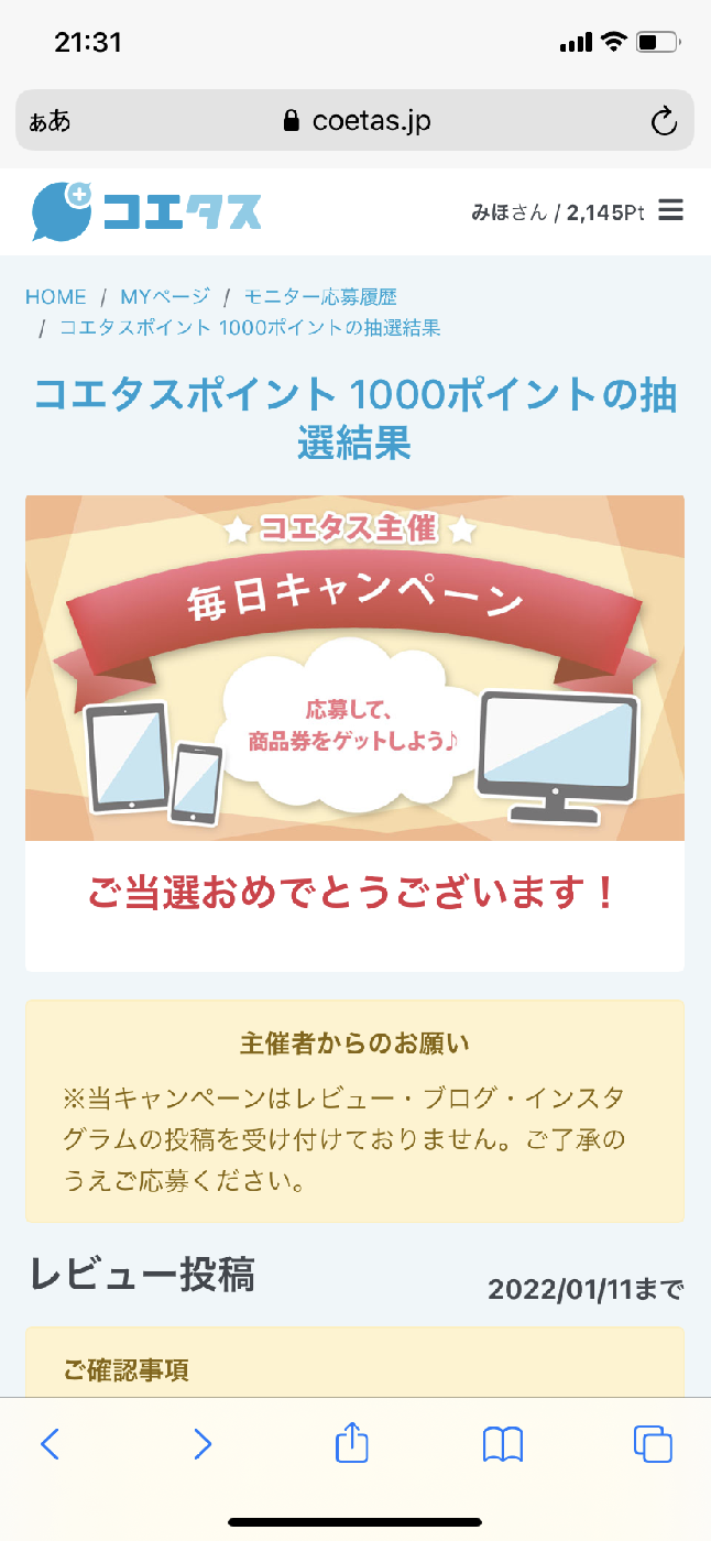 コエタスさんの毎日キャンペーンに応募したところ、コエタスポイント1000ポイント当選しました!!!