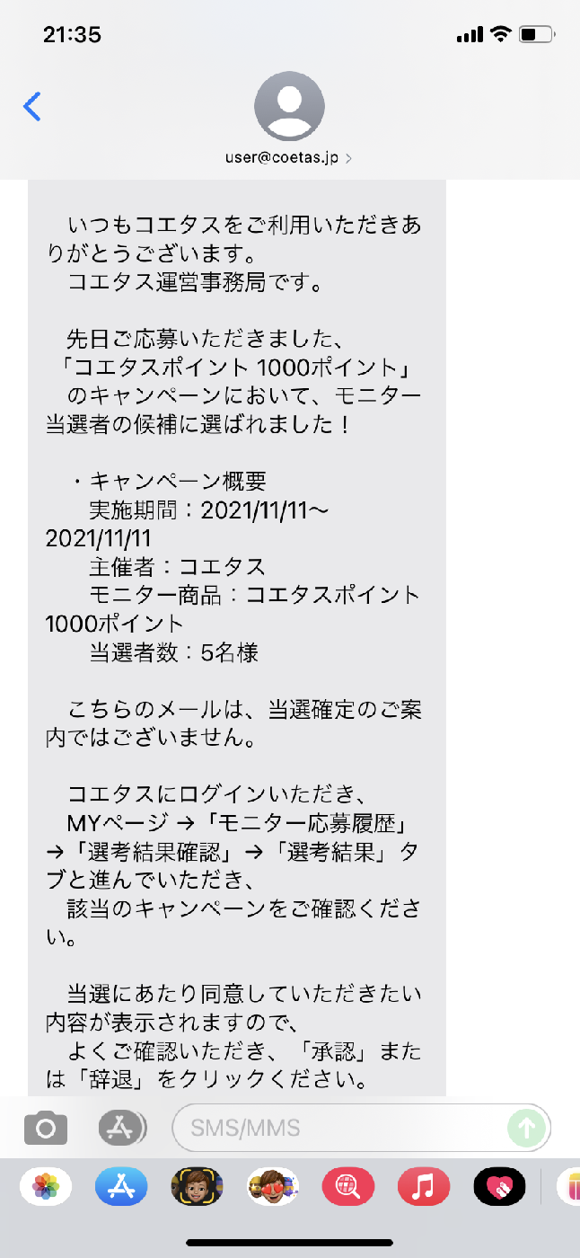 久しぶりにコエタスさんを開いて1番最初に目に入ったので応募したのですが、数時間後にメールが届きました📩
