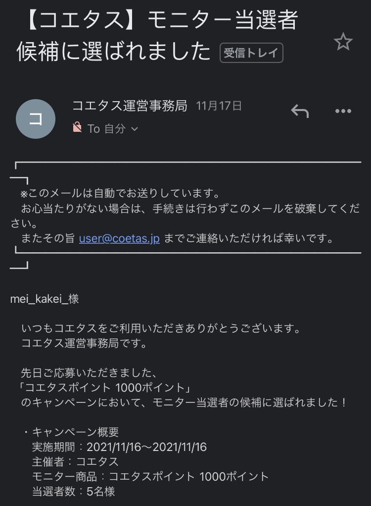 【当選!】コエタスポイント1000ポイント|モニター mei_kakei_さん