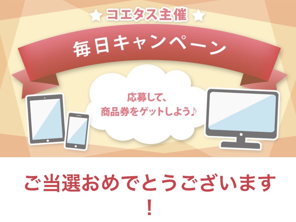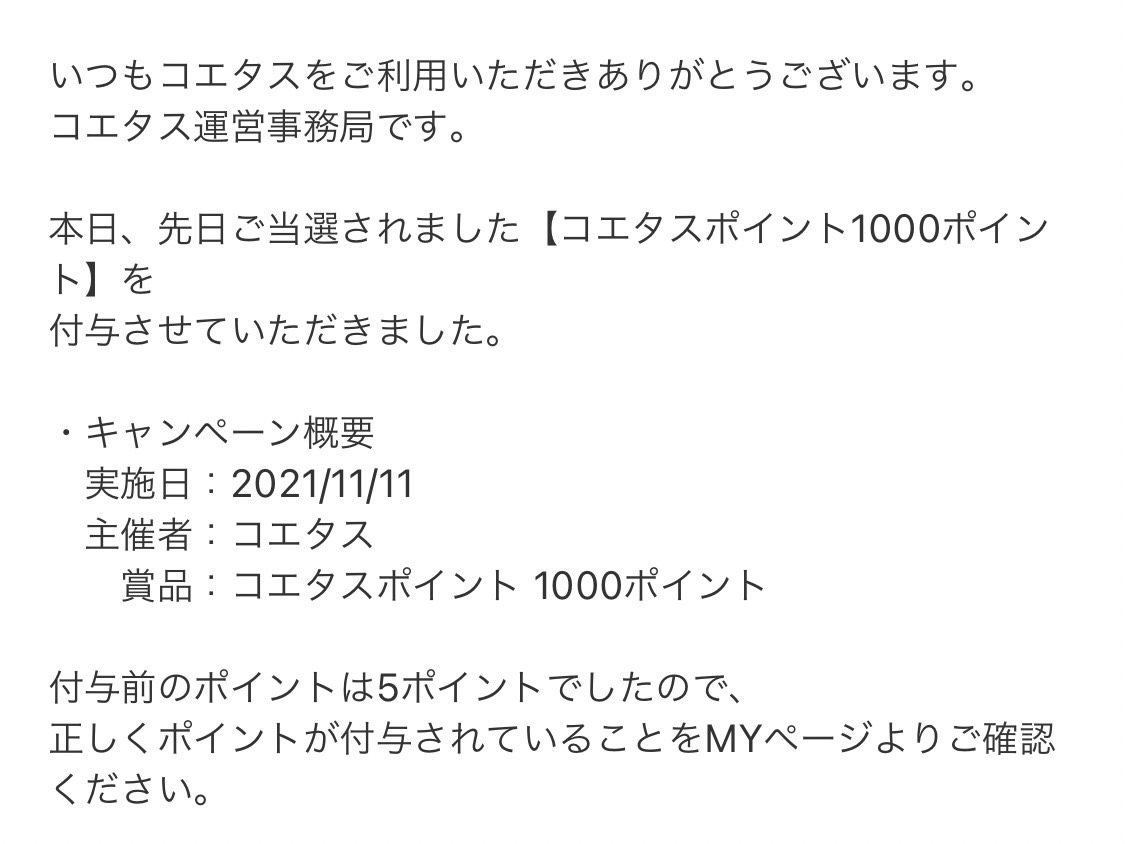 コエタスさんの毎日キャンペーンに応募したところ、コエタスポイント1000ポイント当選しました!!! あり...