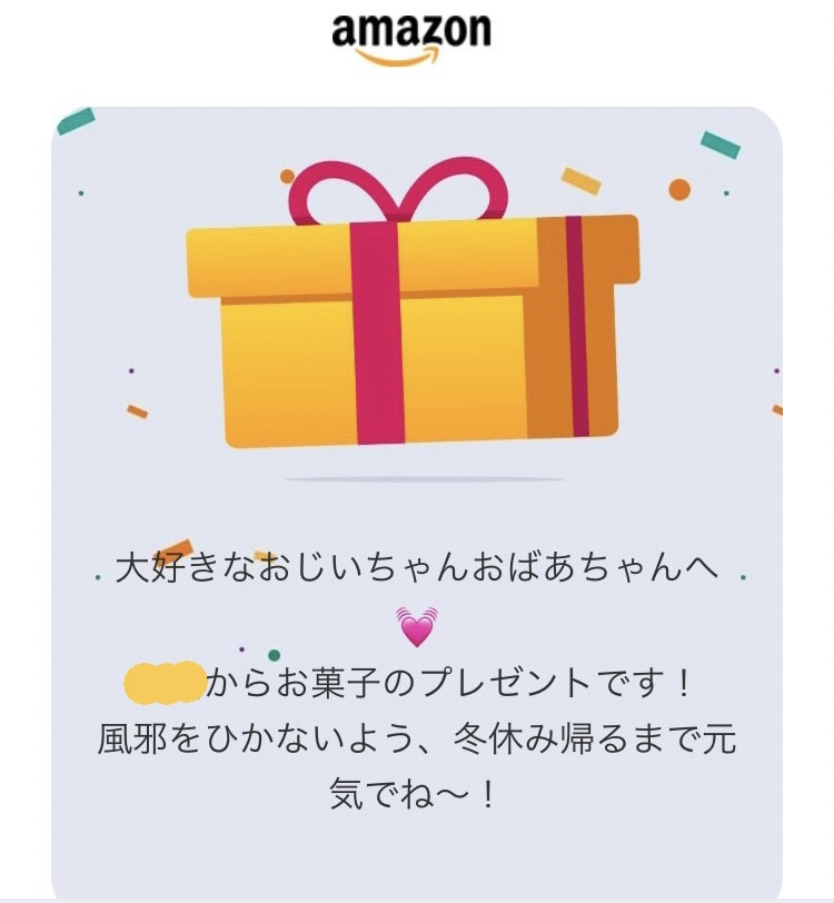 Amazonギフト券1000円に当選しました!✨💓私はこのギフト券を使って、離れて暮らす祖父母にお菓子のギフトセットを送りました💕小さい頃から本当に可愛がって貰っていて祖父母のことが大好きなのですが、コロナの影響で一年近く会えていません😭何かギフトセットを送りたいと思っていたのですが、学生ということもありお金に余裕がなく、なかなか実現できない日々でした🥲しかし、このたびamazonギフト券1000円分に当選したので、やっとギフトを送ることが出来ました〜!✨💓祖父母から、お礼の電話とお手紙も届いて相当喜んでくれたようです💓このような機会を作ってくださって本当に感謝しています💕✨またギフト券が当選した際には自分の大切な人を喜ばせる事に使おうと思います!☺️