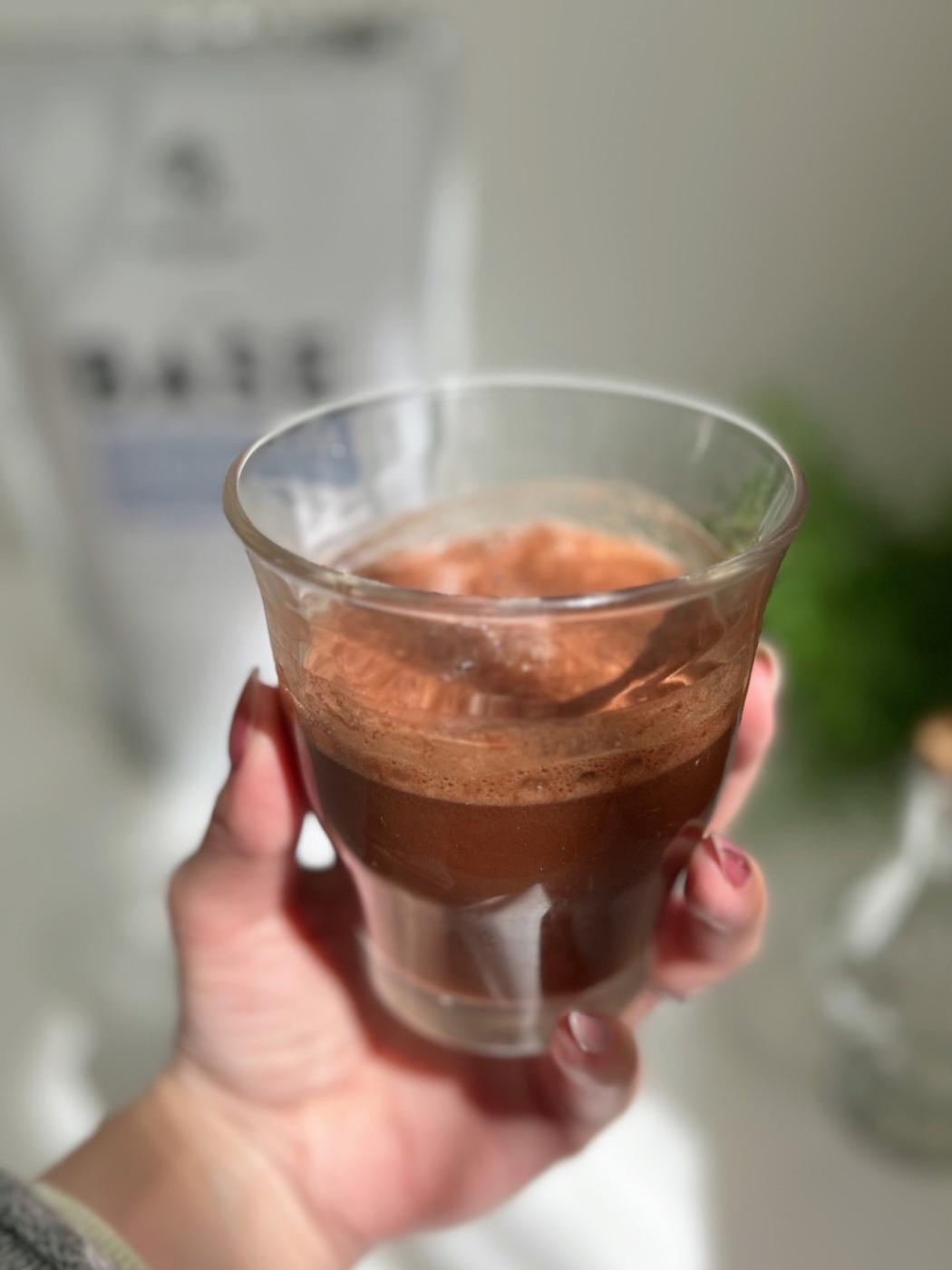 シェイカーで作ったら、粉の溶け残りなしでココアの色のドリンクが出来上がりました☺️