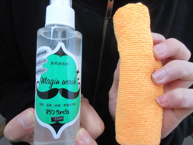 先程と同様、汚れに向かってマジンウォッシュを1プッシュ致します。そして、専用クロスで優しく拭きます。