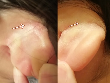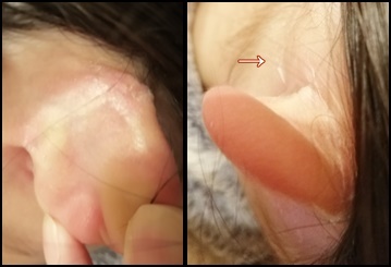 凹凸なので中々貼るのが難しかったですが、→部分うっすら薄皮のようなものが見えるかと思いますが、ここから耳の上の付け根部分まで貼っています。