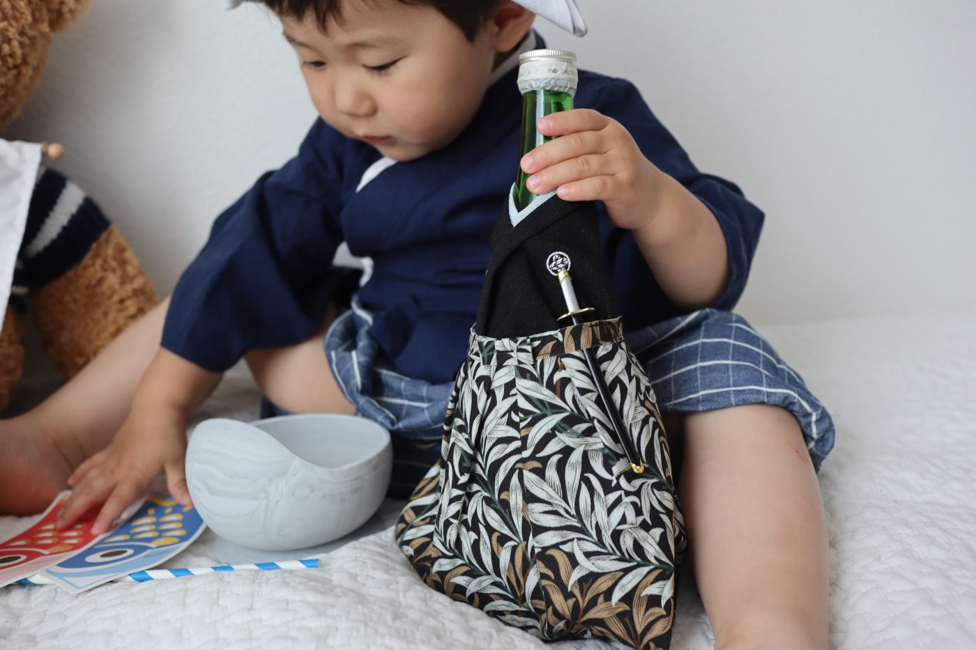 想像以上に簡単にボトルに付けられるのでびっくりしました。付け方もまるでボトルに着せるような感覚でした。ボトルの高さや太さに合わせて多少微調整してカバーを付けられるのでどんなボトルでも問題なさそうでした。簡単に付けられるのにチープなデザインや生地感ではなく生地も高級感があり細部まで丁寧に仕上げられていました。刀が付いているもの嬉しいです。これも鞘と刀で分かれるのでこだわりを感じました。時期もちょうど5月頃だったので子供の節句に撮影小物として写しましたが素敵でした。子供も刀に興味津々でした。