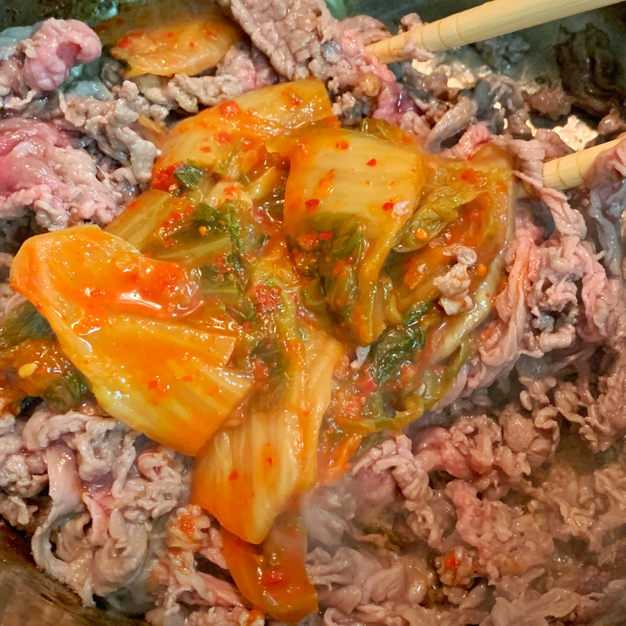①ごま油でお肉と付属されているキムチを汁ごと焼きます。