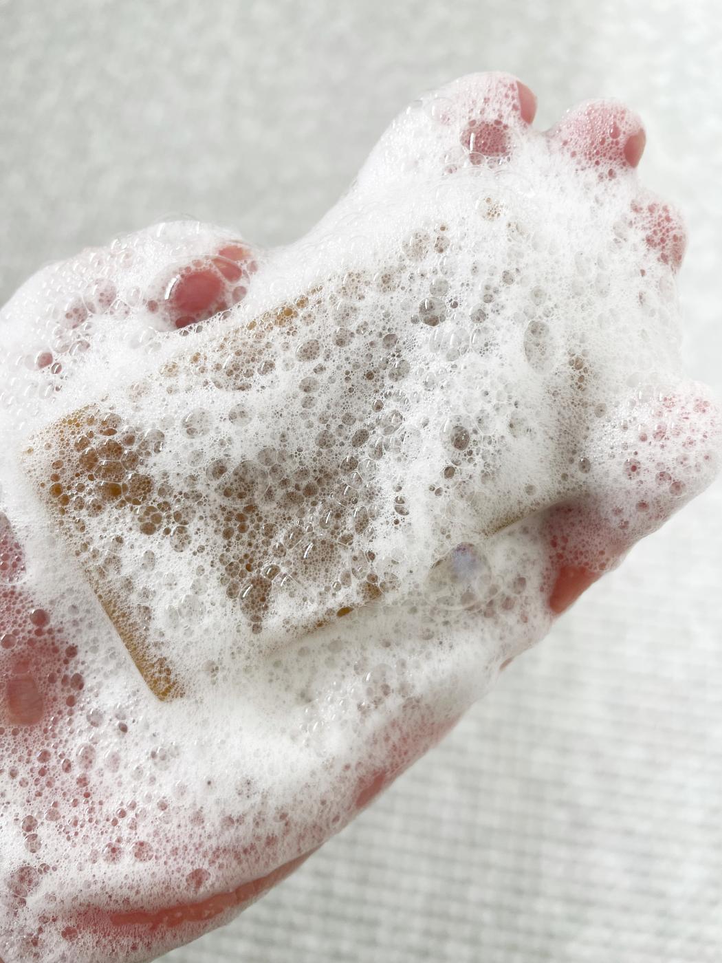 切りっぱなしのナチュラルな石鹸を取り出し、泡立てネットで泡立てていまいきます。
