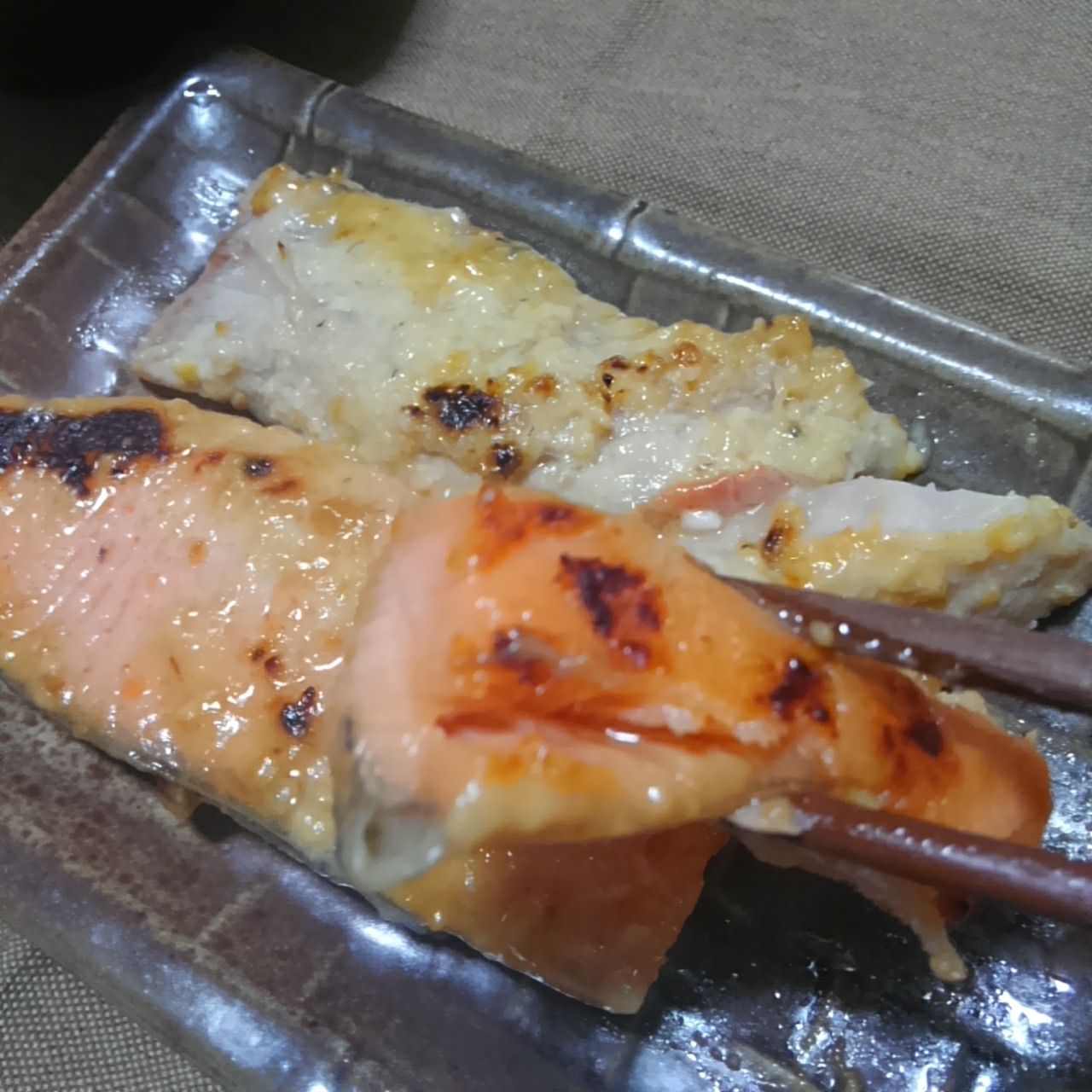 食べたのは、金目鯛とキングサーモンの西京味噌漬けです。