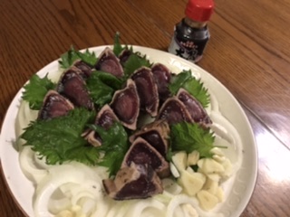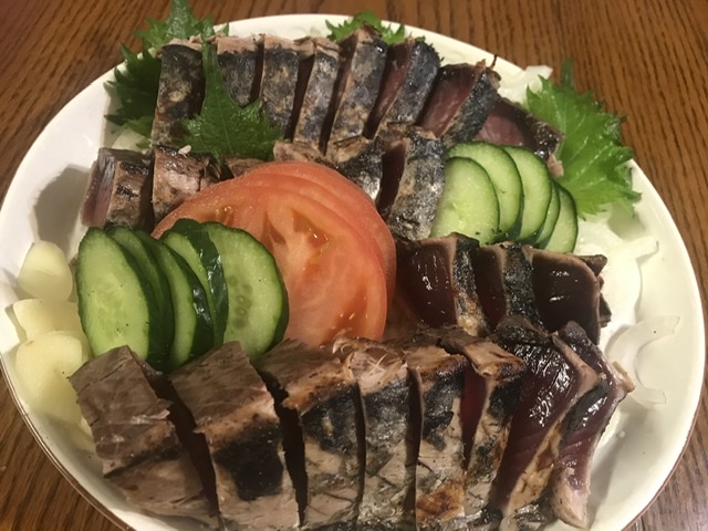 薬味をたくさん載せて厚切りにして大蒜と一緒にどうぞとお出しすると県外の友達も高知に来て良かったーと感動してくれました。