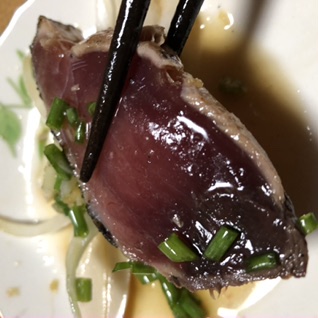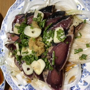 冷凍便で届く3パックの藁焼きカツオタタキ。食べたい時に流水にパックごと10分ほどつけておくだけで、ちょうど良い塩梅に解凍されます。半解凍の状態で切り分け、旬の新玉ねぎの上にのせ、ネギや生姜・大蒜などをトッピング。同梱された大熊特製のタタキのタレをまわしかけていただきます。