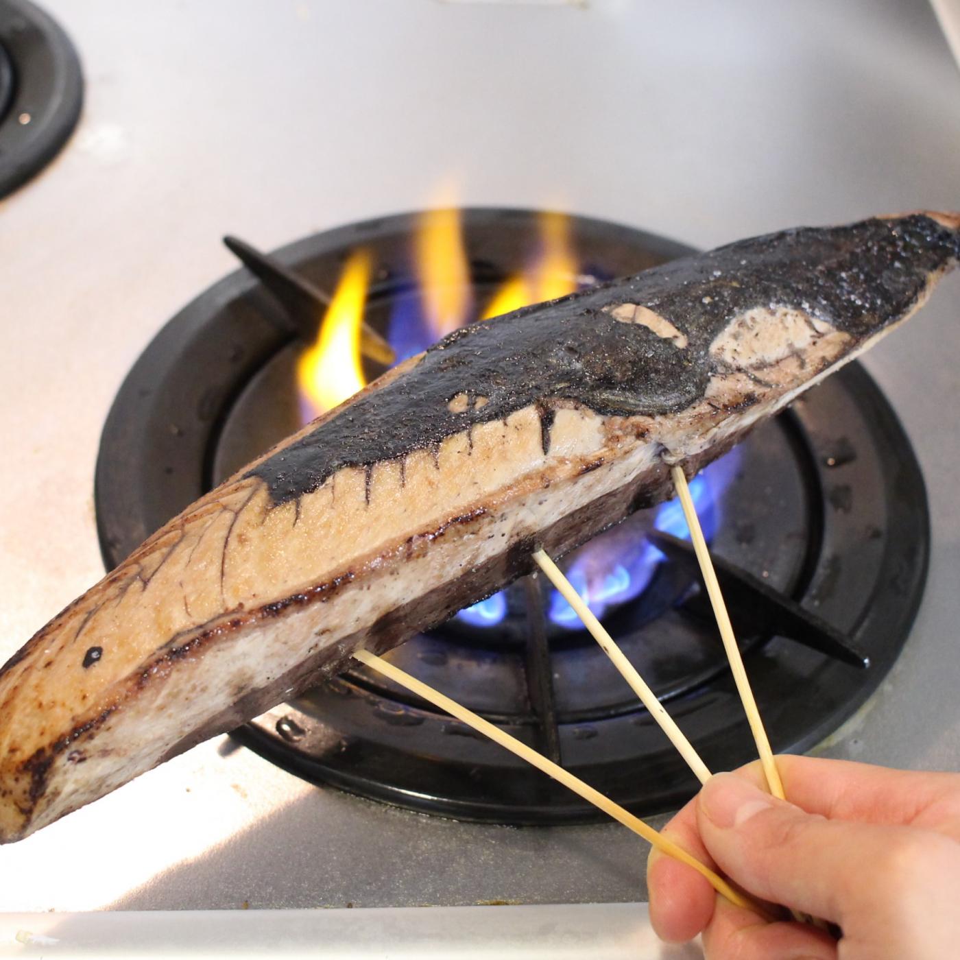 節のままたっぷり岩塩をふってガスコンロで表面をあぶります。