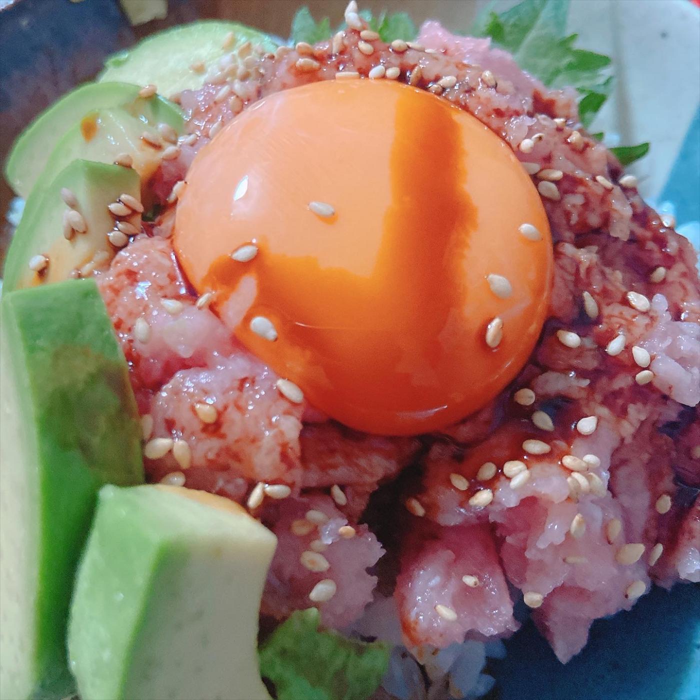 旦那さんと私はアボカドと黄身を添えてネギトロ丼にしてみました??