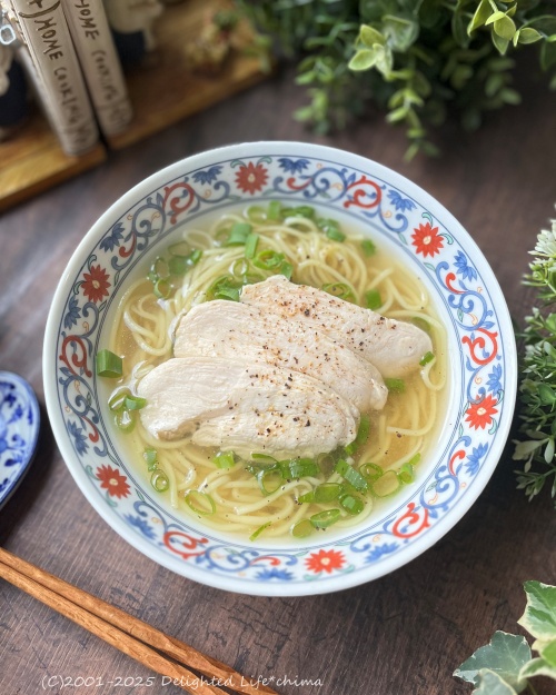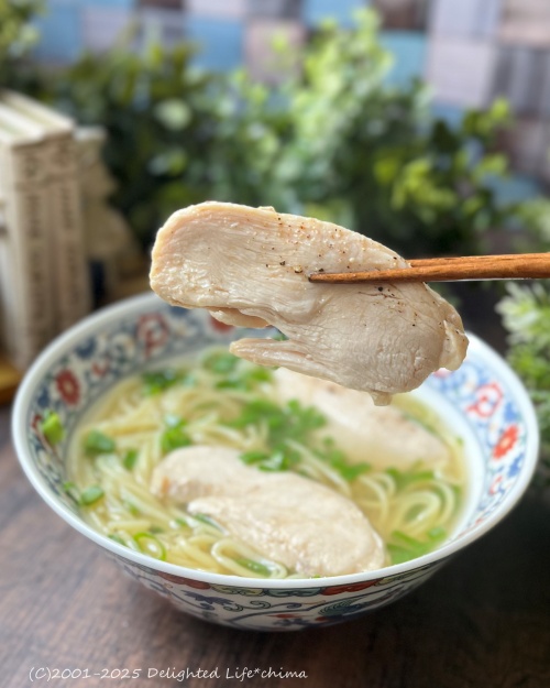 ③どんぶりに盛り付けシッ鶏、小ネギをトッピング。