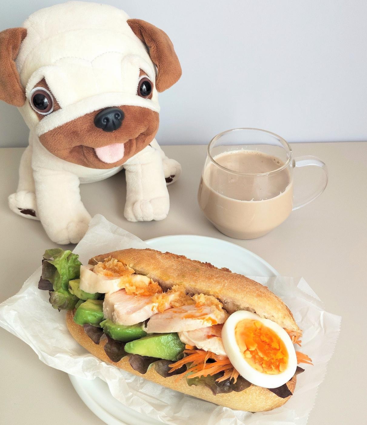 別の日には、ミニミニサイズのバゲットを焼き、カットしたシッ鶏と、ありあわせの野菜、ゆで卵を挟んで、仕上げに付属のタレと薬味をトッピング。