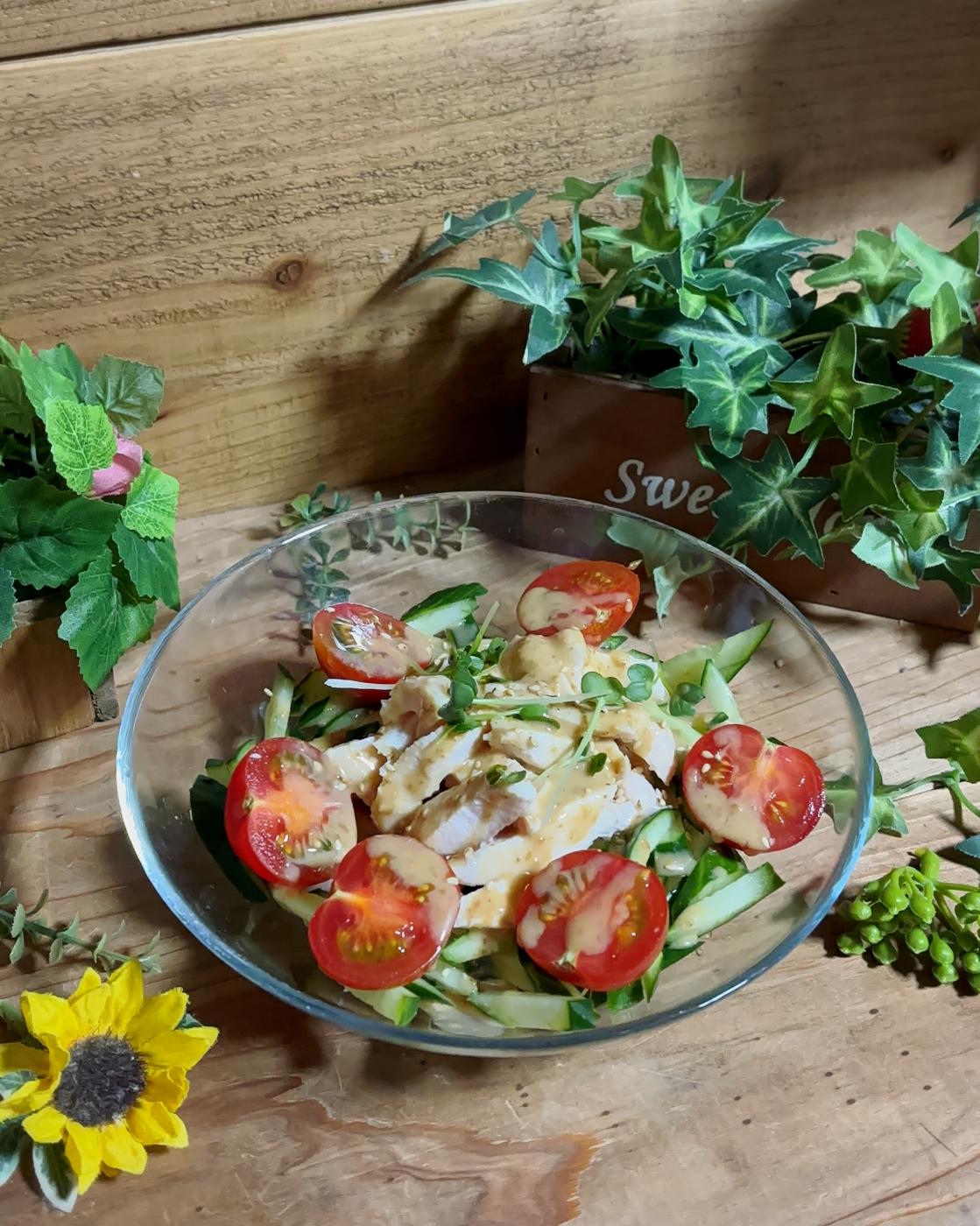 次は千切りきゅうりとプチトマトを合わせて棒棒鶏風にしてみたんだけど、ごまだれをかけるとコクのあるタレとシッ鶏のやさしい旨味のバランスが絶妙に美味。