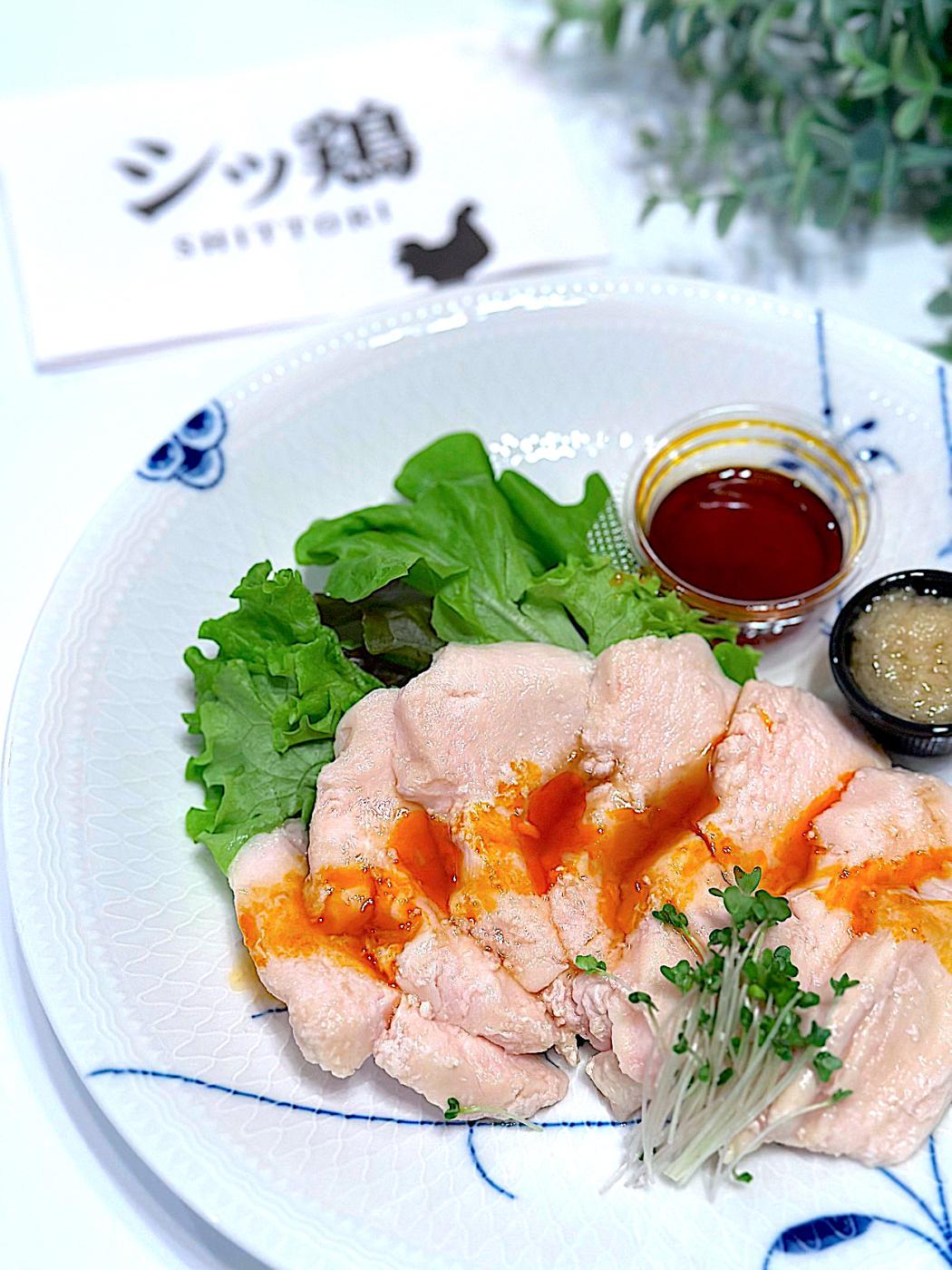 そう、「シッ鶏」とは、通常パサつきがちな鶏むね肉を、特別な調理法で名前の通り“しっとり”に仕上げた特別な一品♡