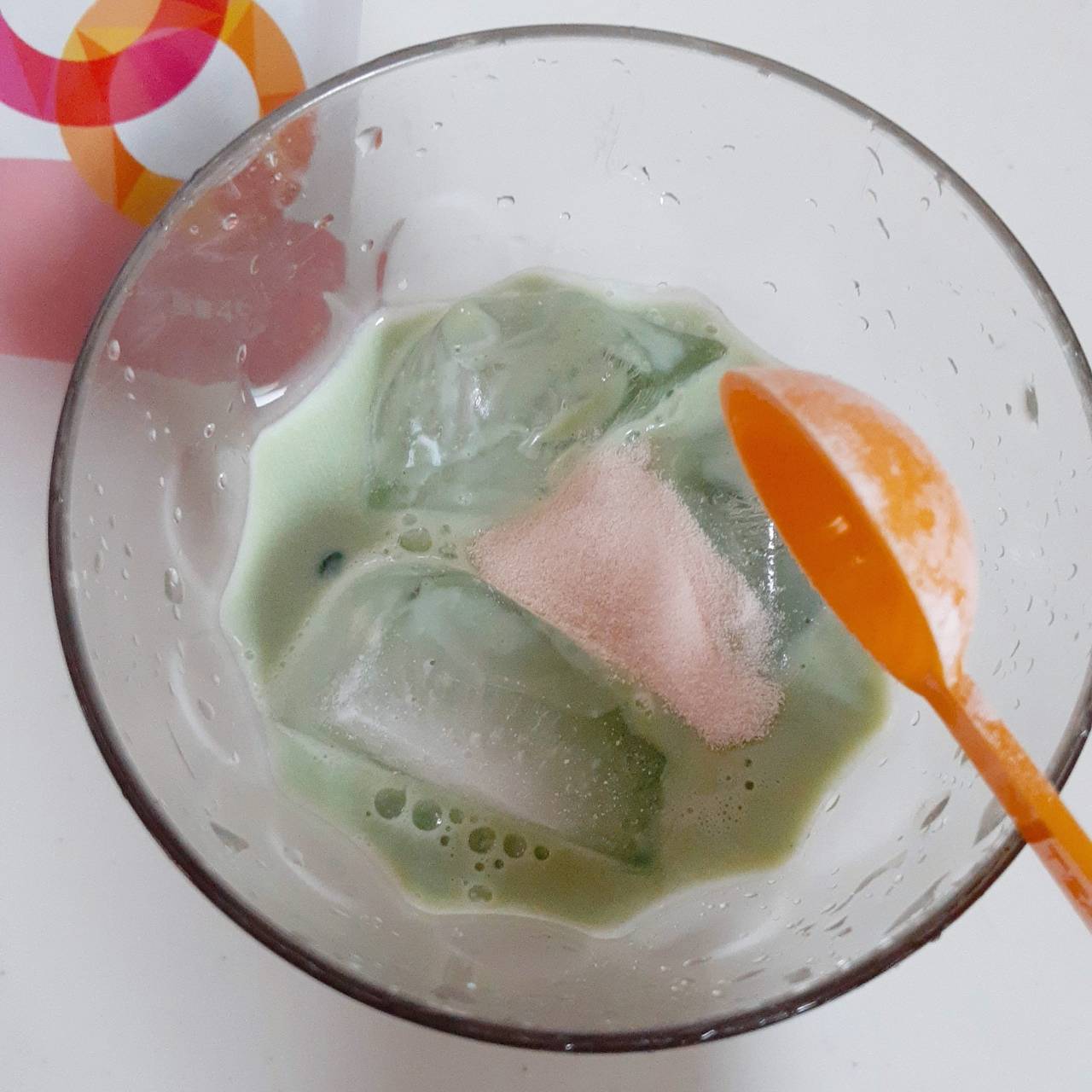 付属のスプーン1杯(約1g)に、抹茶大さじ1/オリゴ糖大さじ1/牛乳を合わせてる♡