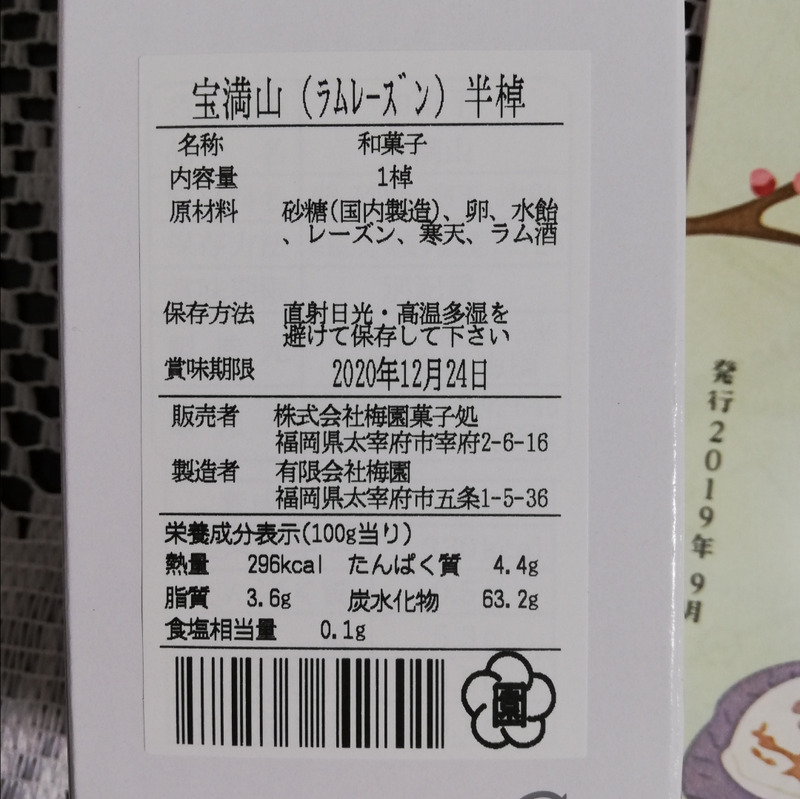 今回は半棹サイズで、商品名も「宝満山(ラムレーズン)半棹」とラベルに書かれてあったのですが、内容量はなぜか1棹となっていました。