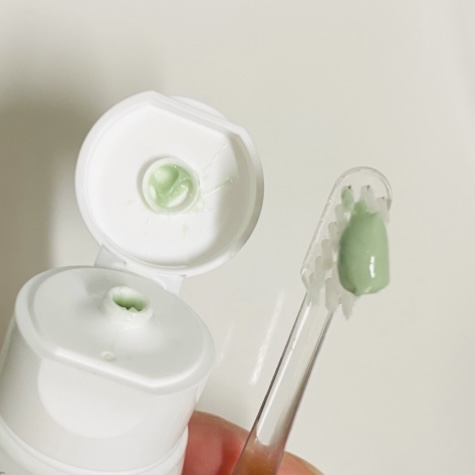 片手でもパカっと開くタイプの蓋で使いやすい。柔らかすぎずかたすぎない程よいテクスチャー。沢山泡立たないタイプでゆっくり磨ける。