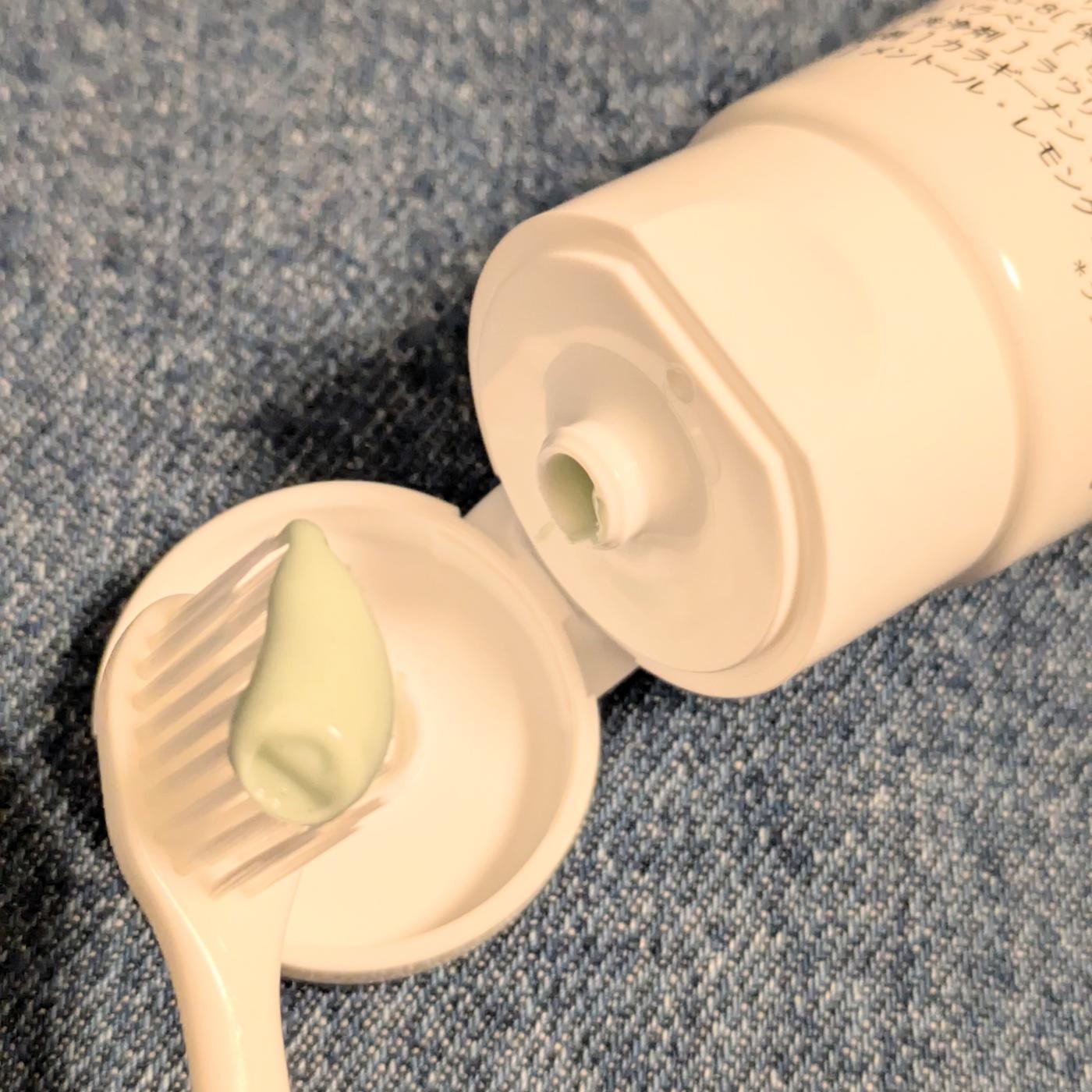 歯磨き粉はミントのような水色で、すっきりとした爽やかなデザインに、ホワイトニング効果などをポイントをピンクで分かりやすく表現しています。テクスチャーも硬すぎず使いやすい柔らかさで、泡立ちは多くないので磨きやすかったです。