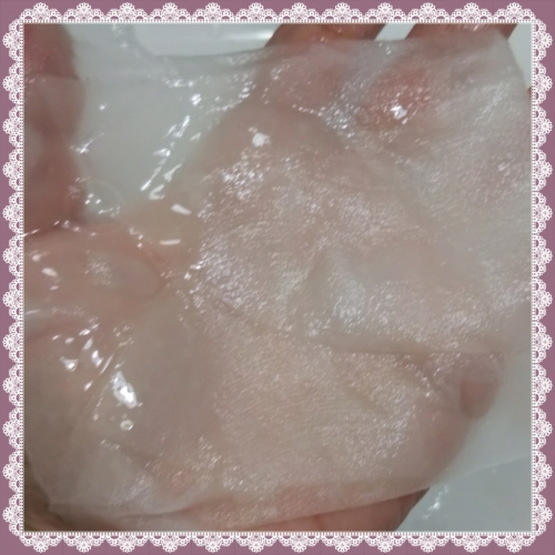物によっては20分もつけていると端の方から乾いてくるシートもあるなか、こちらのコラーゲンエッセンスマスクは20分つけていてもシートはしっかり美容液が詰まった状態です。