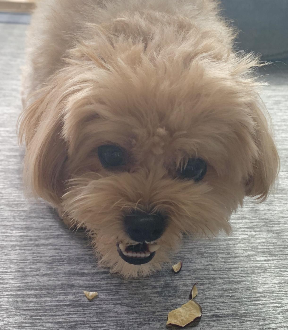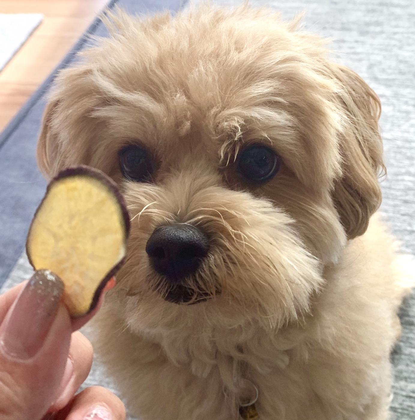 早速さつまいもチップスをあげました。袋を開けた瞬間に猛ダッシュで駆け寄ってきて「ちょうだい」アピールが凄かったです。