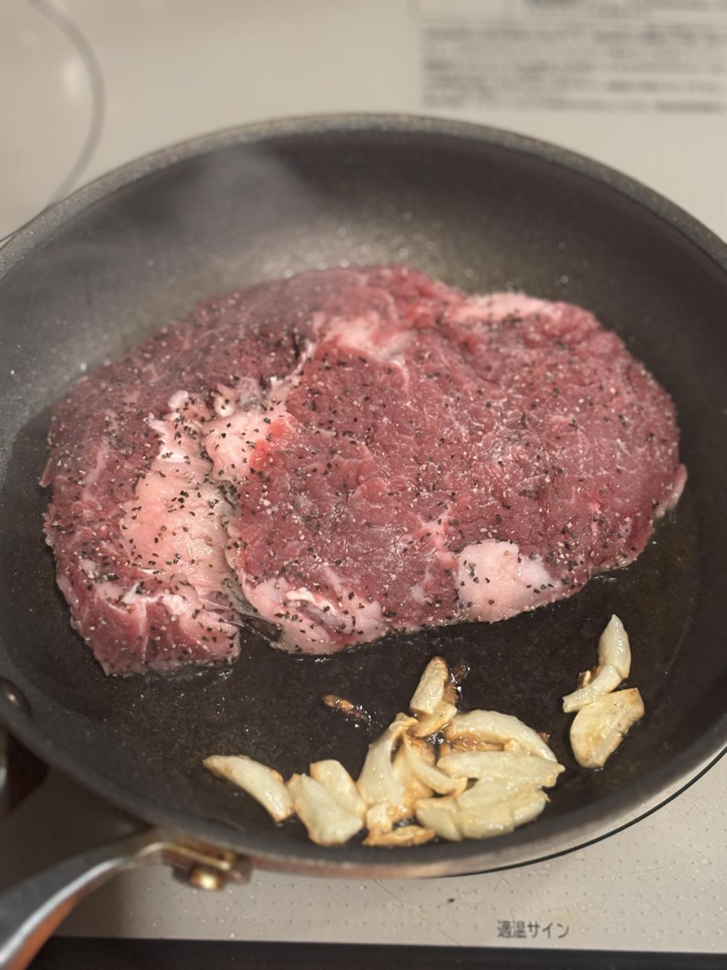塩胡椒したら、にんにくで香りをうつした、油で強火で蓋して蒸し焼きに。