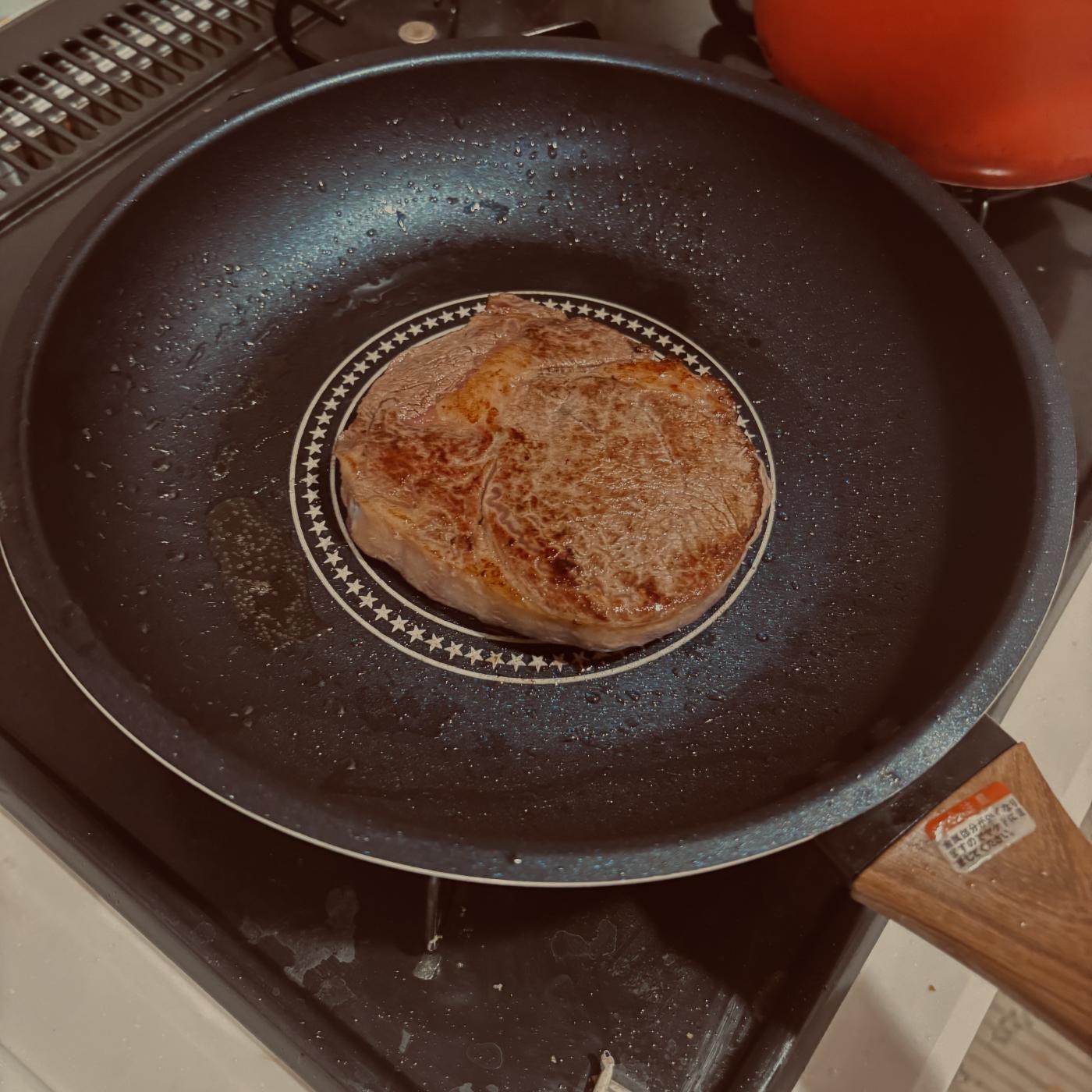 お勧めの焼き方の通り前日から解凍しフライパンで表面を焼いた後、オーブンでじっくり焼き、最後にフライパンで表面を焼きました。