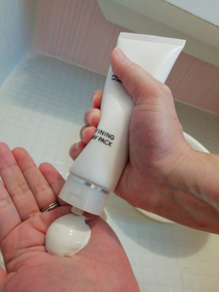 リファイニングクレイパックの使用方法は、夜の洗顔後のきれいな顔の水分を軽く拭き取り、首筋まで伸ばして撫でるようにしたあと1〜2分マッサージします
