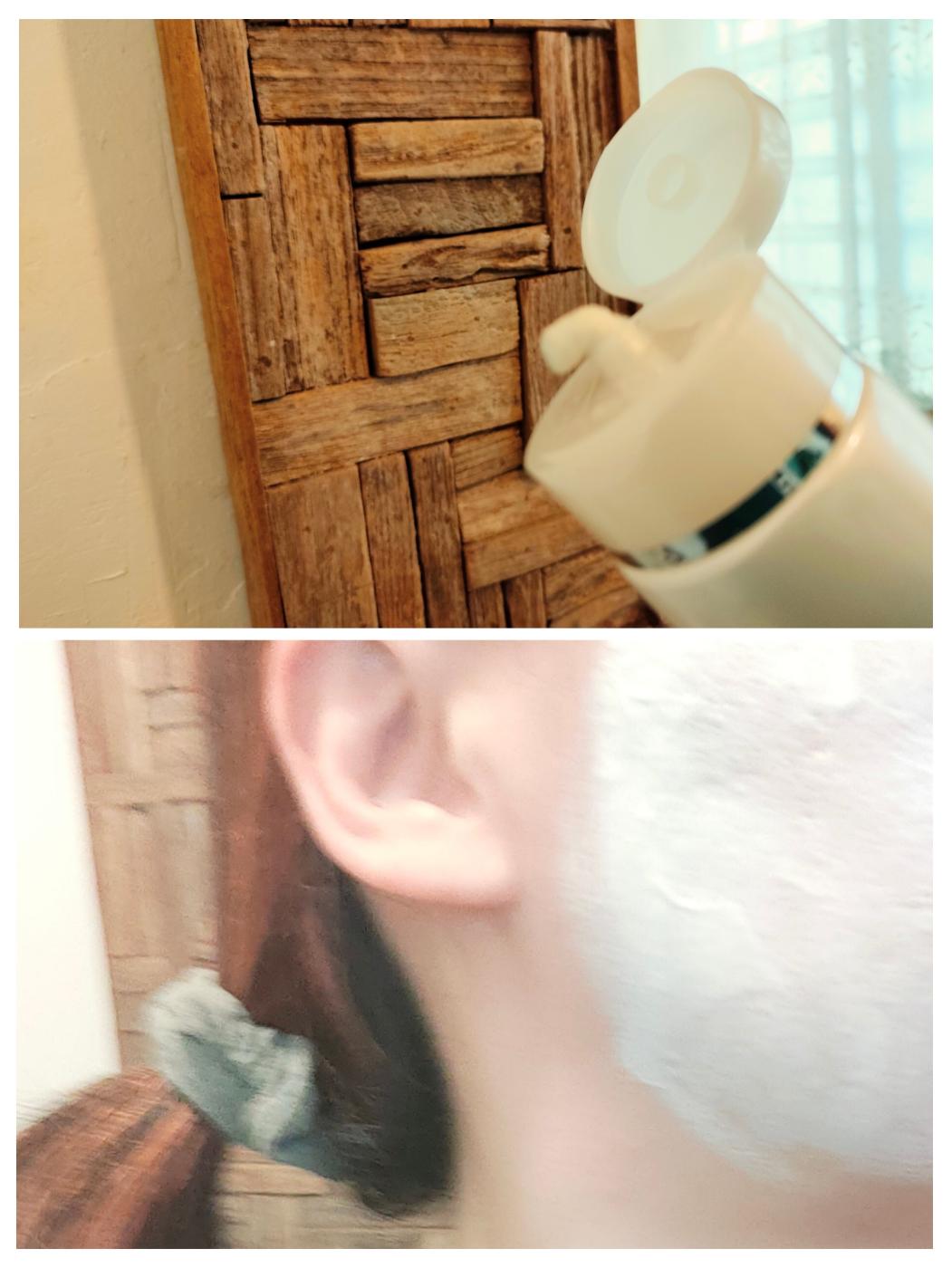 洗顔後に軽く水分をふき取り、大さじ1杯強の量を顔全体と首すじにのばして軽くクルクル。