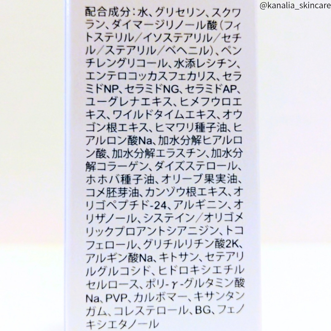 ヒト型セラミドやヒアルロン酸などの保湿成分のほか、環境ストレスケア成分としてオウゴン根エキスを、バリア機能ケア成分としてヒト由来の乳酸菌・エンテロコッカスフェカリスを配合するなど、成分にこだわった処方になっています🕵🏻♀️