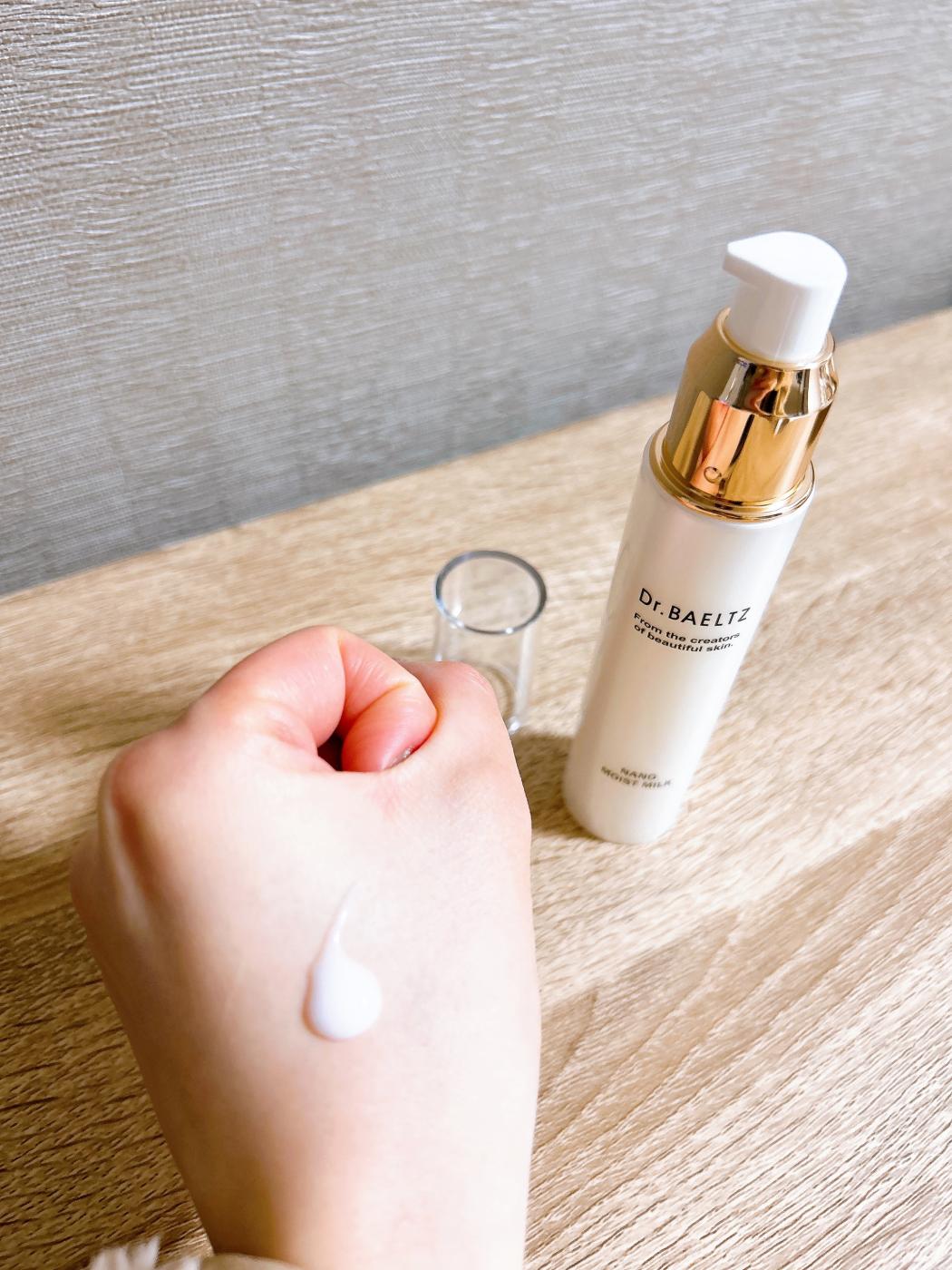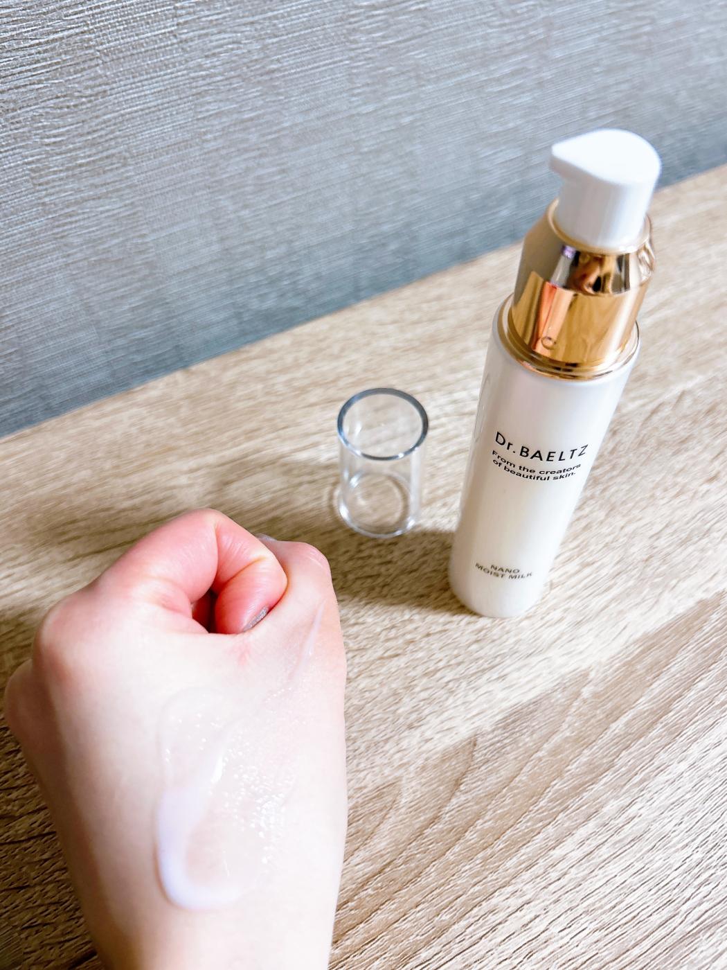 テクスチャーは少しとろみのあるミルクっぽい質感で、伸びが良くて肌にすっと馴染んでくれます。