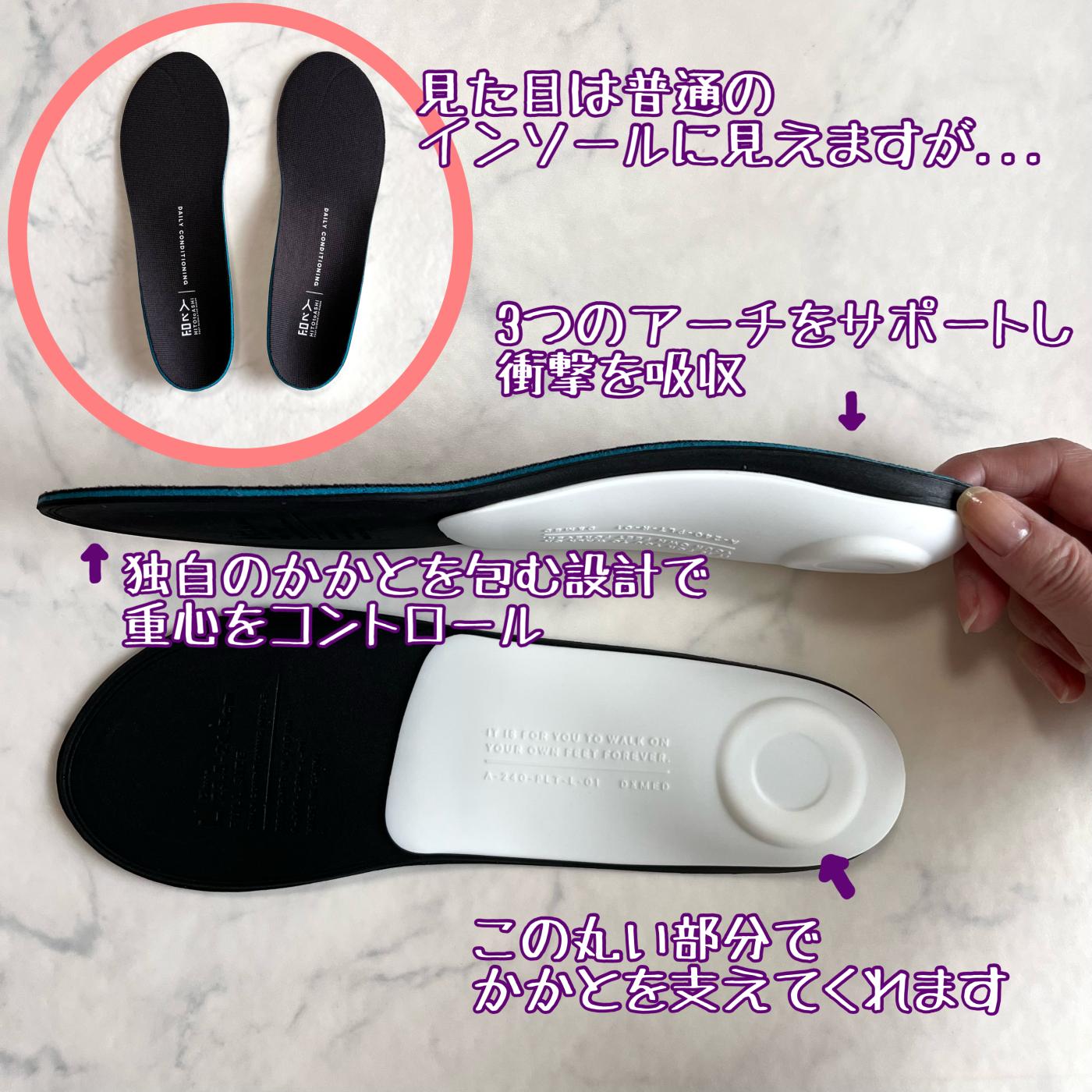 他にも同じ場所に長時間立ちっぱなしだと腰が痛くなったりふらついたりしていたのですが、インソールのおかげで正しい姿勢がキープされていたのか、痛みもふらつきもありませんでした。