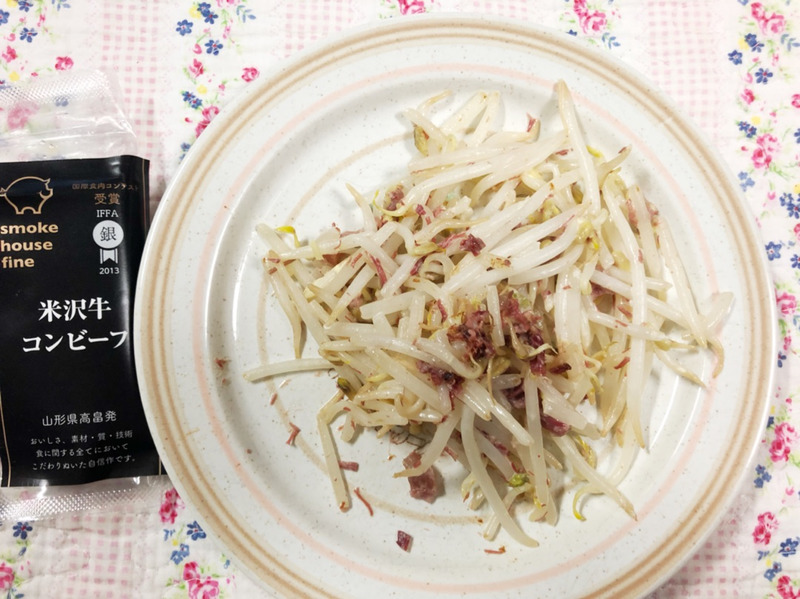 もやしのシャキシャキ食感と米沢牛コンビーフのなめらかな食感の変化が楽しいです。