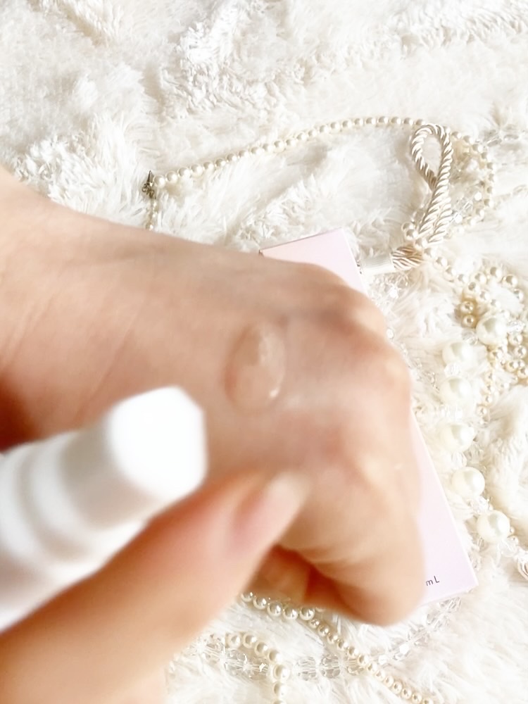 手に取ると、透明で少しとろみを感じるのですが、塗った後は肌表面は軽やかでベタつかず、肌にすっとなじむ感じ。