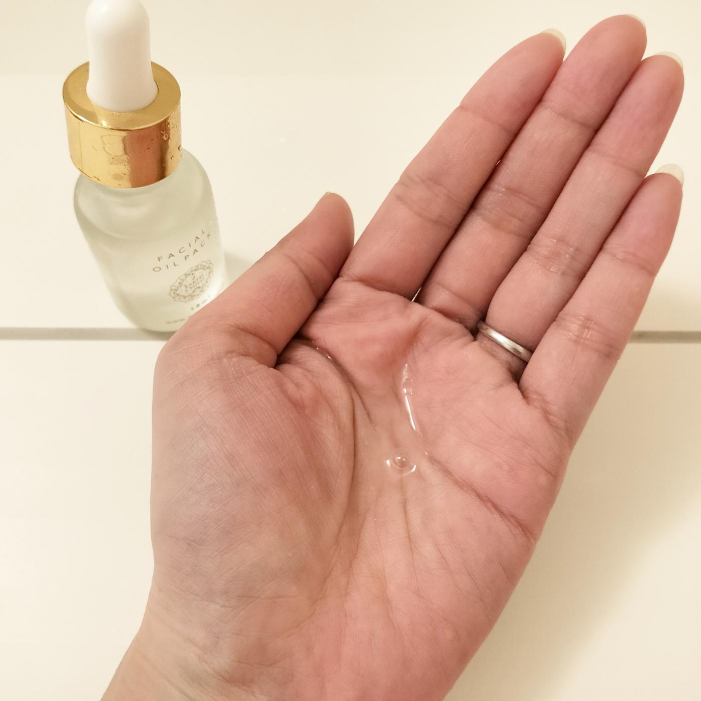顔の水分をふき取って、スポイトひと吸い分のオイルをなじませてみました。(手のひらに出している写真は半量です)