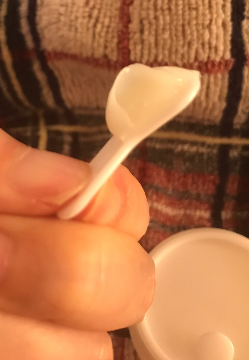 開封すると内蓋の外に小さめのスパチュラが入っており、スパチュラの頭ほど量を手に取って顔に五点置きして両手で包み込むようにして肌になじませてみました。