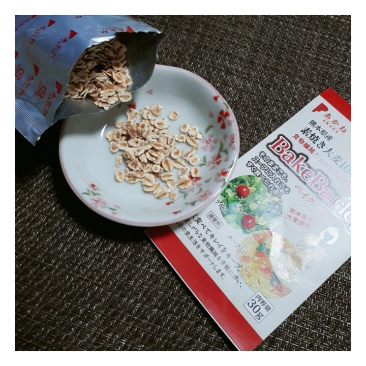 熊本県産の大麦を素焼きした、あかねベイクバレーをいただきました! 素煎り大豆やアーモンドなど、素材...
