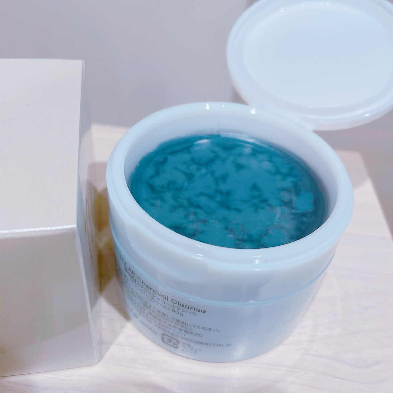 こちらのクレンジング、吸着炭バームを付属のスパチュラで取り、お肌に馴染ませるととろとろと溶けてきて…アイラインなどの濃いメイクや毛穴汚れをすっきりオフして