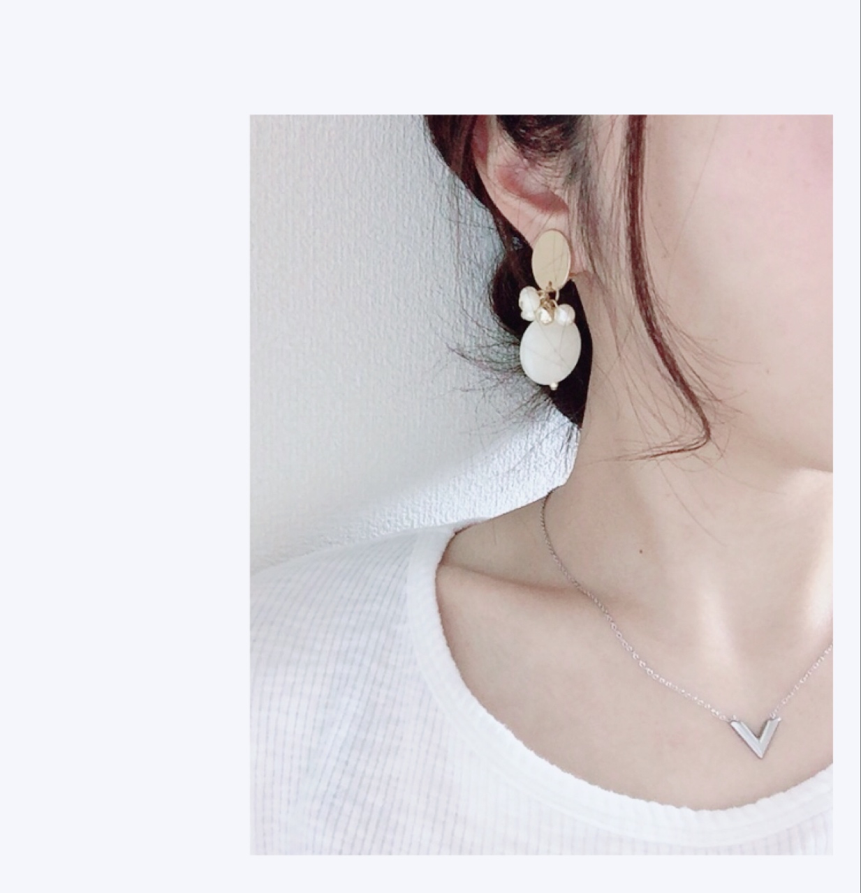 カジュアルな格好としては、白の無地Tシャツに合わせました。洗練されたデザインのネックレスが全体をキュッと引き締めてくれて、Tシャツでもルーズになりすぎませんでした。