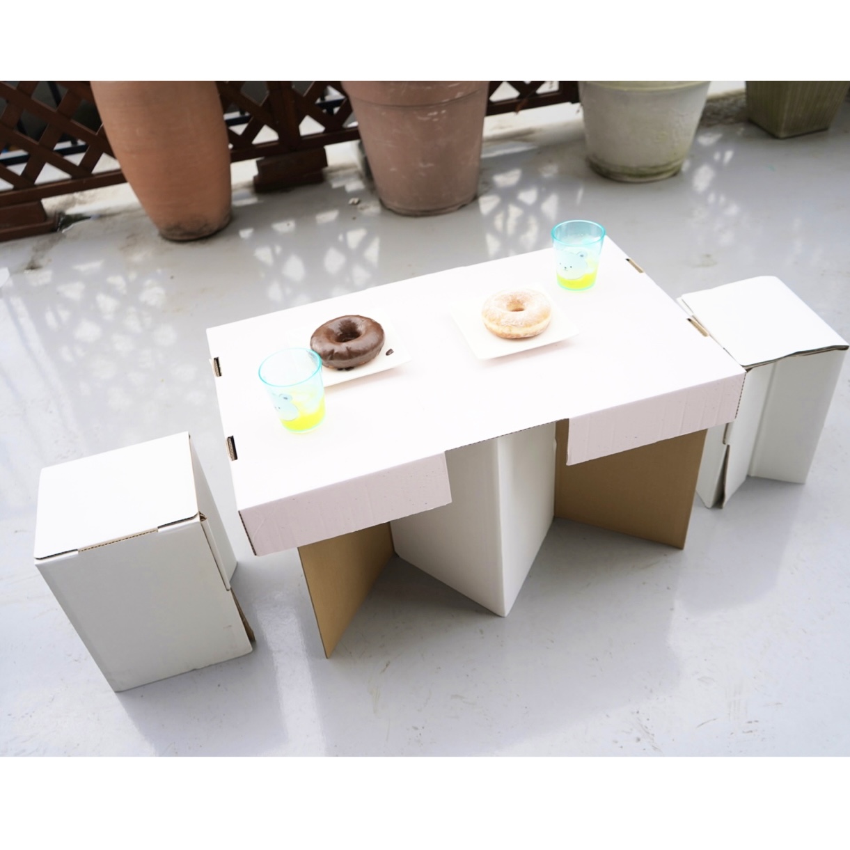 ダンボール素材で作られている、テーブルと椅子のセットです。