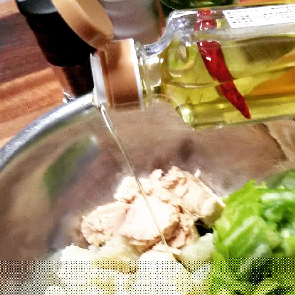 茹でたじゃがいも・大きめカットの塩もみキャベツ・ブロックタイプのツナをボウルに入れたら塩胡椒とレモンとはねにんにくオイルを入れてまぜただけです。