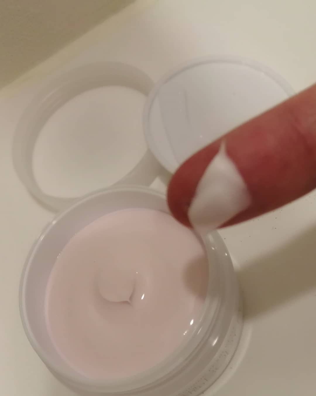 見た目はほんのりピンク色で無臭のクリームなんですが、手に取ってみるとさらってしていてべたつかず、若干クリームが固めに感じますが伸びはよくしっかりとお肌に馴染みます❣️