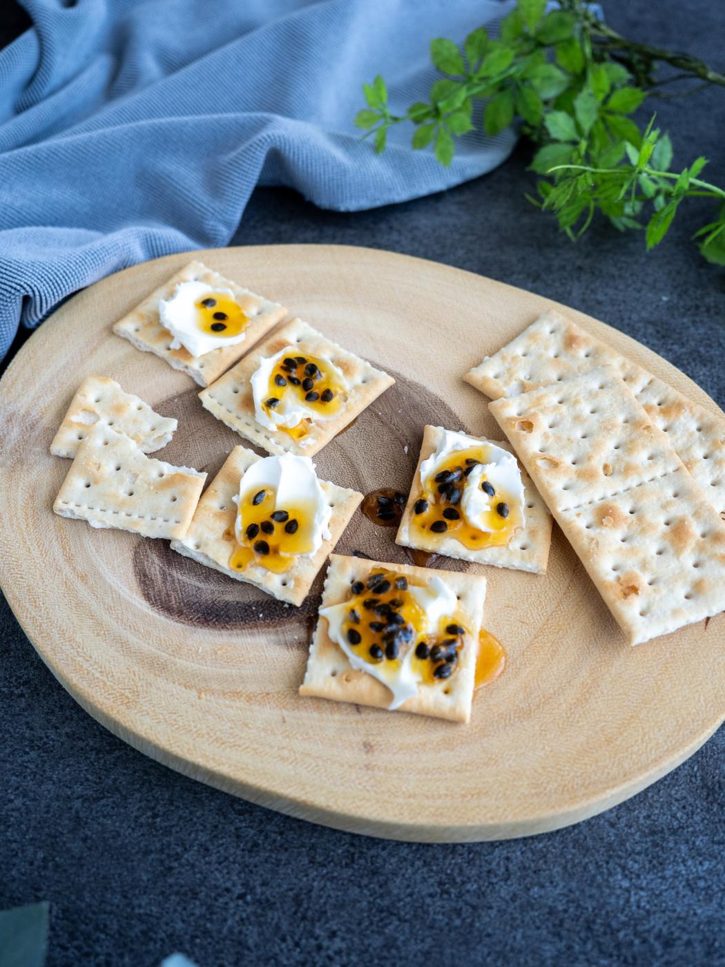 ちょっと緩めのパッションフルーツジャムを作ったら、クラッカーにクリームチーズ を塗って