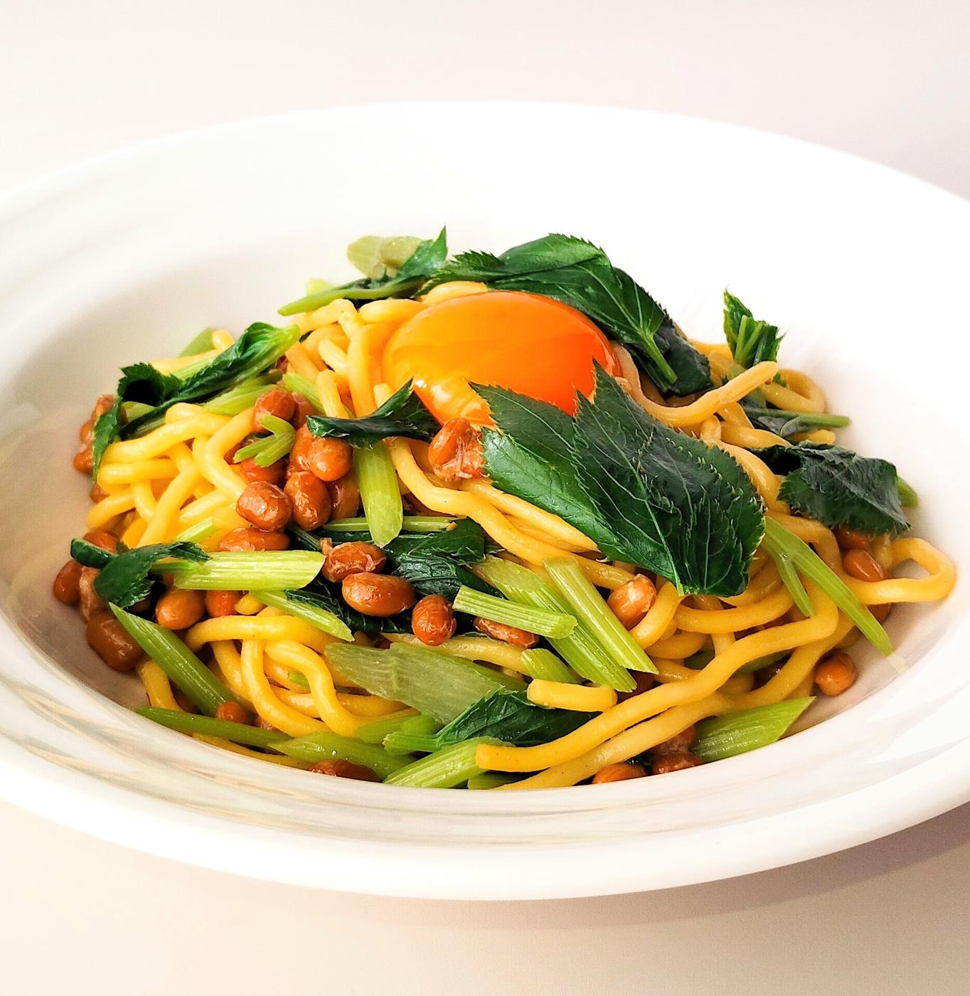 納豆のコクと、明日葉の爽やかな苦みが重なって、深みのある味わいに。葉の一部はサッと茹でて、茎などは生のまま軽く炒めて合わせたのですが、一口ごとに抜けるオリエンタルな香りがクセになりそうな美味しさです🍝