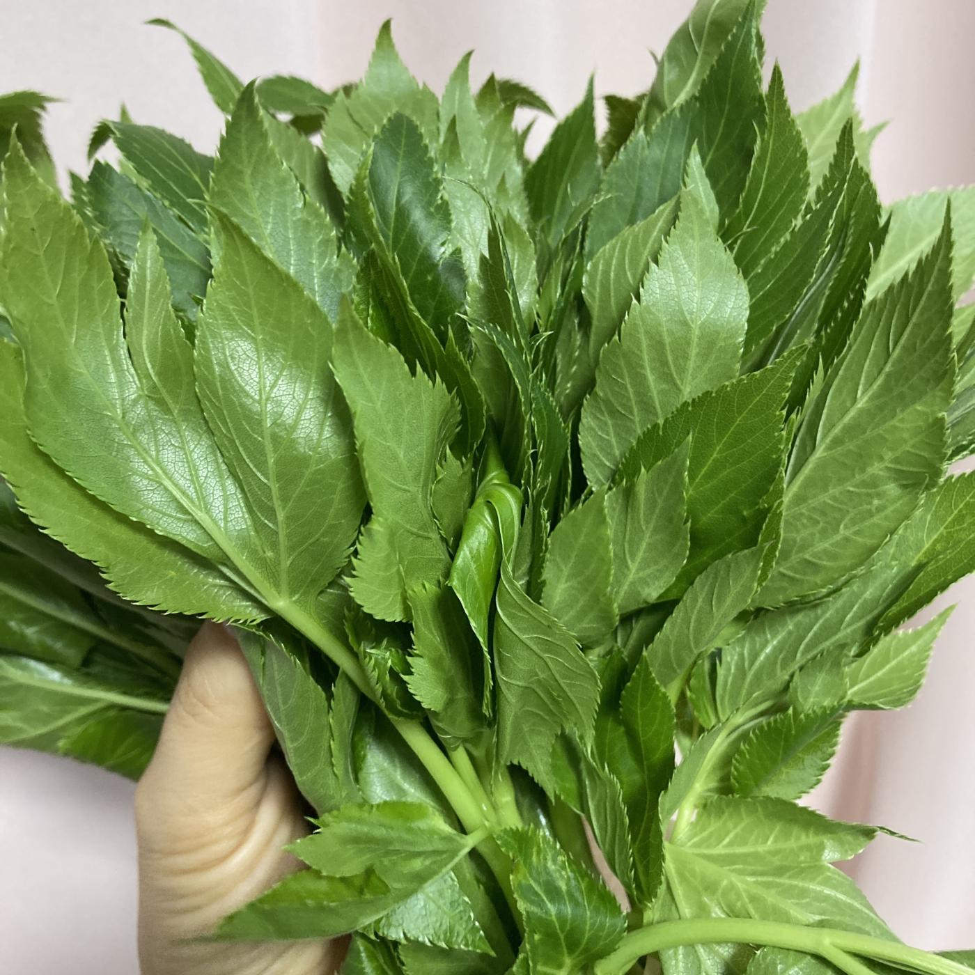 こちら、とっておきの自然栽培のアシタバです。まず色と香りの力強さがぜんぜん違いますね。茎を折ったときにふんわり立ちのぼる青い香りが濃いと思います。土の風味というか、野草らしいワイルドさを少し感じました。葉はふわっとやわらかいのに、噛むと芯のある味わいに感動。