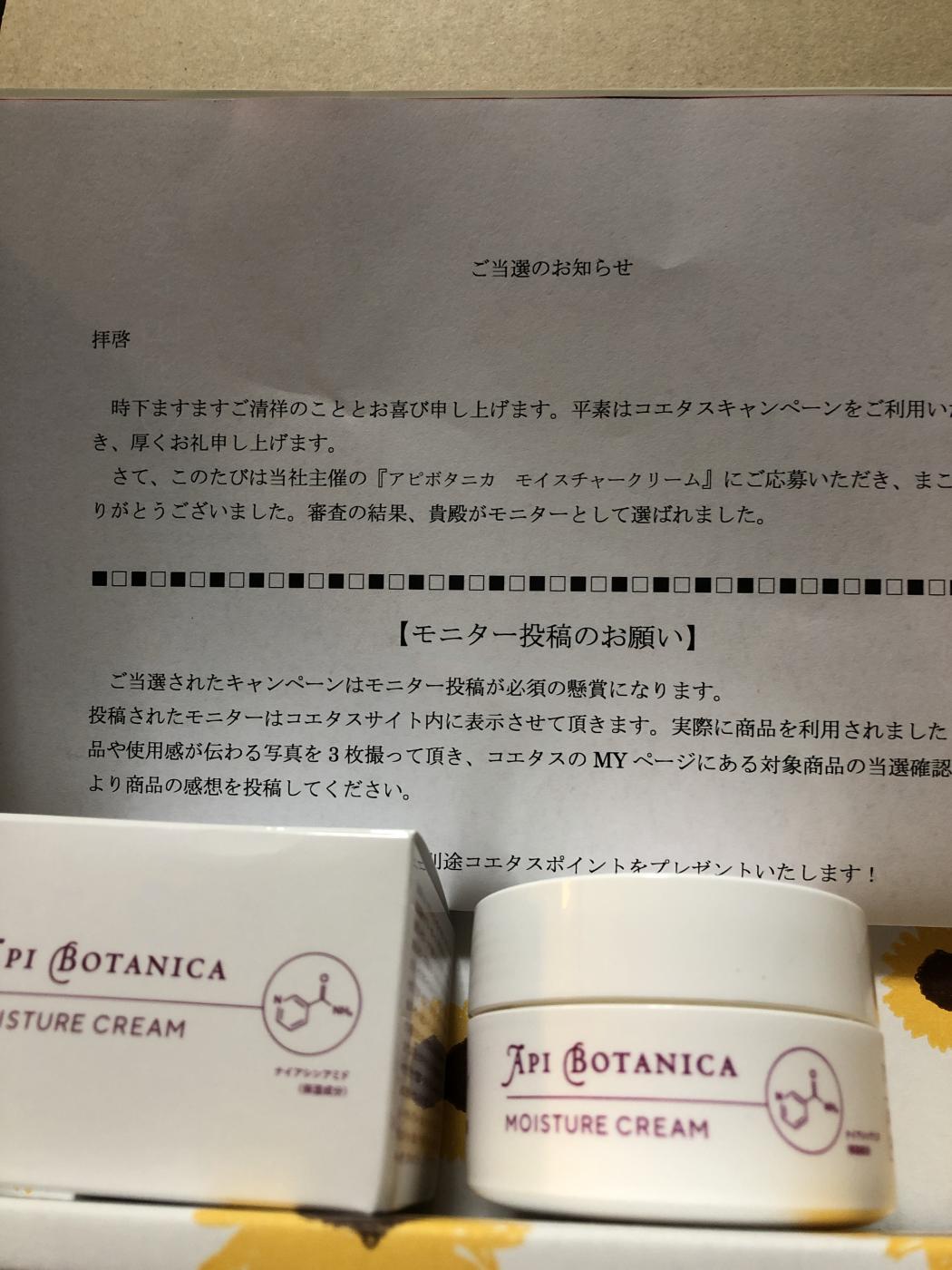 コエタスのモニターキャンペーンでもらった「アピボタニカ モイスチャークリーム」についてのレビューで...