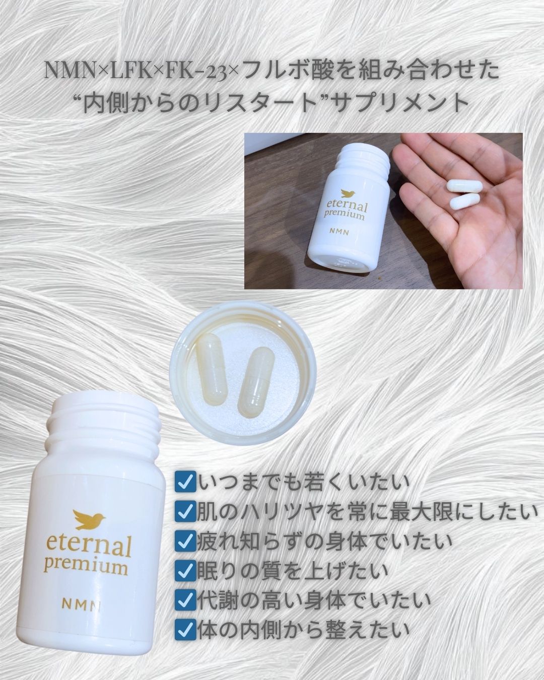 eternal premium NMN は、NMNを中心にこだわりの成分を配合したサプリで、日々のコンディションを整えたい時に取り入れやすいアイテム。